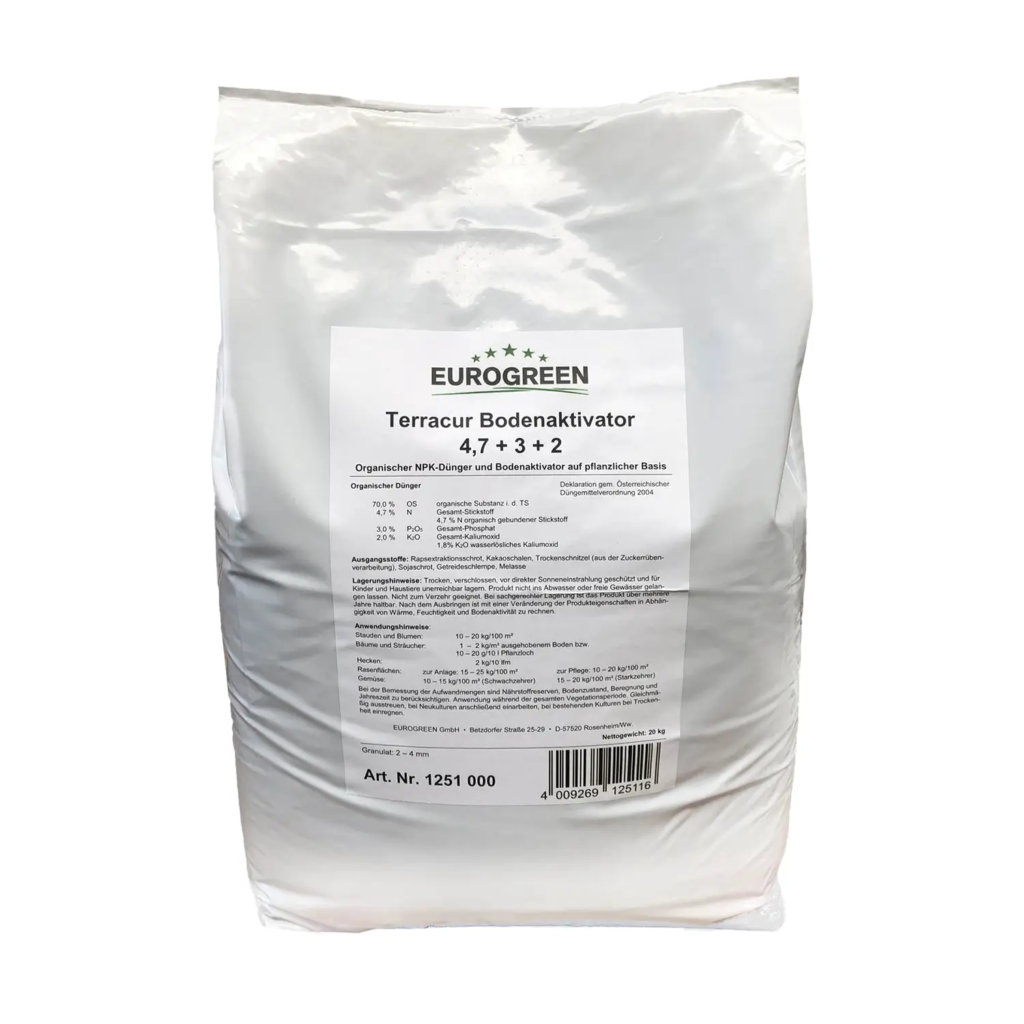Der Terracur Bodenaktivator (4,7 + 3 + 2) ist ein organischer NPK-Dünger und Bodenaktivator auf pflanzlicher Basis, der das Bodenleben, die Fruchtbarkeit und die Struktur nachhaltig unterstützt. Mit einer hochwertigen Zusammensetzung aus pflanzlichen Bestandteilen, die aus nachwachsenden Rohstoffen gewonnen werden, ist dieser Dünger ideal für den Garten- und Landschaftsbau und völlig frei von tierischen Materialien. Der hohe Anteil an organischer Substanz fördert das Bodenleben und sorgt langfristig für eine stabile und lockere Bodenstruktur.